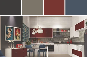 Inspiração de outras décadas, essa cozinha faz uma releitura de um ambiente moderno pela funcionalidade, mas com uma cara retrô. Os tons mais vibrantes, como o bordô e o azul-petróleo, reforçam essa tendência na mobília e nas paredes do cômodo. O branco predomina, mas ganha destaque com as portas e as gavetas coloridas. Ah! O papel de parede também tem importância já que essa textura de tijolos lembra o material de casas mais antigas.