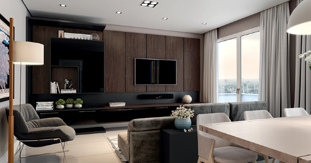 Para tornar a sala aconchegante, é bacana pensar em um aromatizador ou um arranjo de flores — mesmo simples, eles alegram o ambiente.