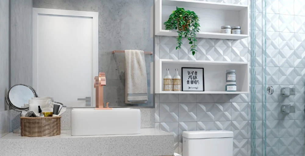 Assim como as prateleiras convencionais, os nichos servem para depositar alguns itens da sua decoração – e são uma ótima dica para preencher paredes vazias. De forma singular, você pode fazer como o exemplo abaixo e apostar em nichos com formatos diferentes: em seu interior, coloque objetos que representem você, como livros, plantas e itens menores. Neste projeto da Italínea, foram utilizados alguns nichos para contribuir com a decoração do banheiro.