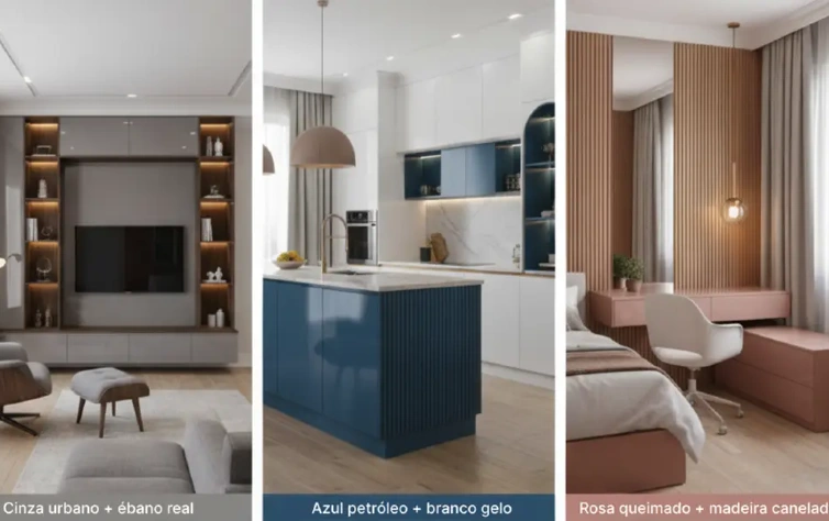 Tons amadeirados com neutros seguem entre os preferidos. A mistura da madeira com cinza, off-white e bege é uma aposta segura para quem quer unir o toque natural com um visual moderno e leve. Nos projetos que pedem mais personalidade, os metálicos e vibrantes aparecem como destaque. Detalhes em dourado, cobre ou preto fosco combinam com cores marcantes — como vinho ou verde escuro — e deixam o espaço mais interessante, sem perder a elegância.