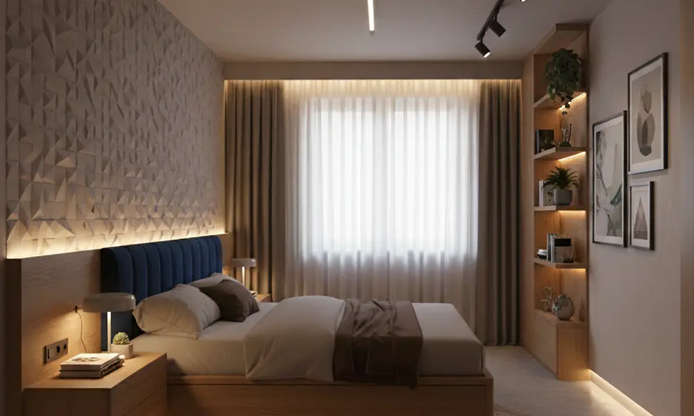 O equilíbrio entre luz cênica e luz funcional é essencial. A luz cênica cria clima e valoriza o projeto, enquanto a luz funcional assegura praticidade e evita sombras ou áreas mal iluminadas, permitindo que o dormitório funcione bem em diferentes momentos do dia.
